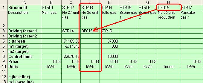 The consumption stream we are going to analyse is STR03, 'No. 25 Unit Gas'. First we must identify its driving factor. We choose DF015 ('No. 25 Unit production') and copy its stream ID into row 3 of the column containing the consumption data: