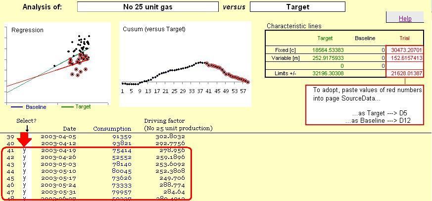 In this example we see from the cusum chart that there is a sustained period of very favourable performance near the end of the chart (indicated by the steep downward slope). Let us use this period as the basis for future performance targets. We select the favourable points by typing any text in the 'Select?' column for those rows only: